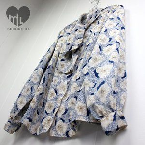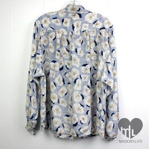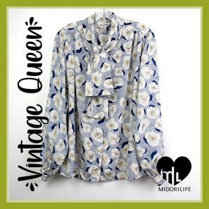 • Features: Long sleeve with button-cuff closure, scarf/bow-tie collar, hidden button-down placket, shimmery polka dot under-pattern, floral graphics