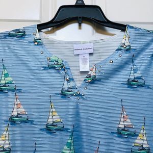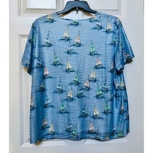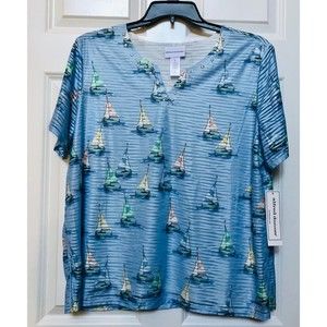 ALFRED DUNNER WOMEN'S SIZE XL BLUE AND SAILBOAT SLIT NECK TOP SHORT SLEEVES