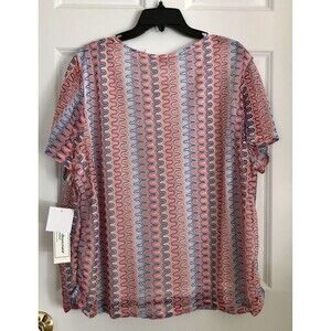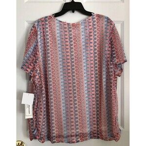 ALFRED DUNNER WOMEN'S TOP TEXTURED STRIPS NEPTUNE BEACH SIDE RUCHING MULTICOLOR, CREW NECK, LIGHTWEIGHT, SHORT SLEEVE, PULLOVER, RHINESTONES, LINED, SHEER, METALLIC. 084