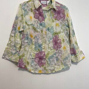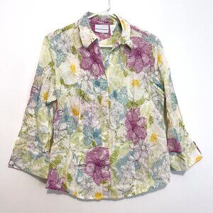 ALFRED DUNNER White Green Purple Floral Swiss Dot 3/4 Sleeve Cotton Button Down