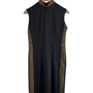 The ultimate in late 60’s early 70’s chic! ALFRED SHAHEEN black column dress with gold Greek Key design down each side as well as on the mandarin collar. Form fitting with front and back darts