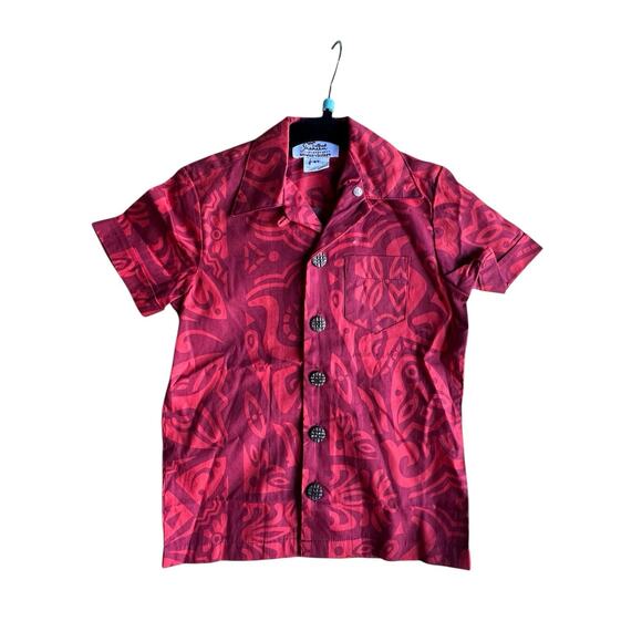 The ALFRED SHAHEEN X UNIQUE VINTAGE Boys Hawaiian Tiki Shirt in red is a stylish and colorful addition to any young boy's wardrobe. Made of 100% cotton with decorative wooden buttons, this short sleeve shirt features a collared neckline and button closure. Ideal for casual occasions during the summer, fall, or spring, this retro-inspired shirt is perfect for adding a touch of Hawaiian flair to any outfit. Featuring a regular fit and a unique brand collaboration, this shirt is a must-have for boys who love to stand out and make a statement.