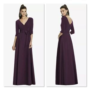 AN37 (tags: evening, formal, gown, ballgown, ball gown, full skirt, wedding party, plus size, bridal party, bridesmaid, mother of the bride, mother of the groom, elbow sleeve, full length, maxi dress, classic, dark purple, lavender, tie front, belted, sash, eggplant)