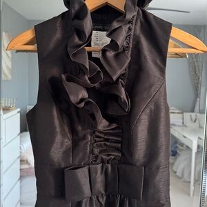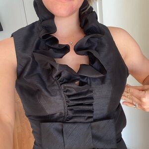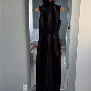Elegant black maxi dress. Features a ruffled neckline. Perfect for formal occasions.