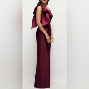 Elegant one-shoulder maxi dress. Features a large bow detail. Sleek and sophisticated design.
