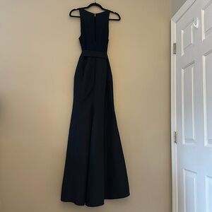 Full length sleeveless dress w/ maracaine jersey bodice. Modified halter neckline. Matching mikado sash at natural waist. Mikado trumpet skirt.