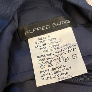 Chic ALFRED SUNG gown in deep midnight blue. Ideal for elegant events. Zipper in back. Pockets! Measures approx 36 inches from center back to hem. Previously owned.