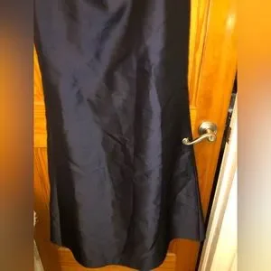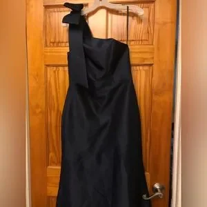 Elegant navy maxi dress. Features a bow detail on the shoulder. Perfect for formal occasions.