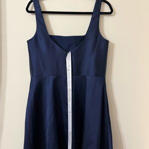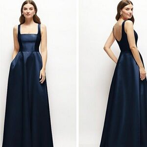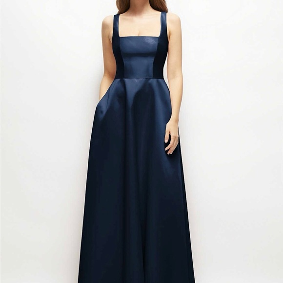 Chic navy maxi dress with square neckline. Sleeveless design and elegant silhouette. Perfect for formal events.