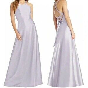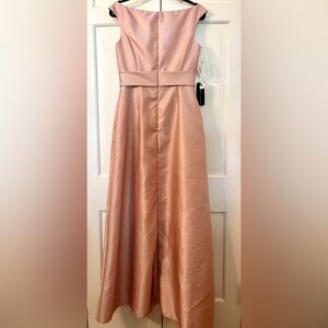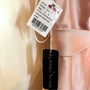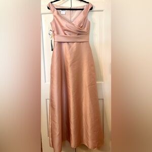 ALFRED SUNG Off-the-Shoulder Draped Wrap Satin Maxi Dress Toasted Sugar 8 AS IS
