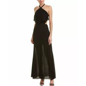 Elegant black maxi dress. Halter neck design. Flowy silhouette. Perfect for evening wear.