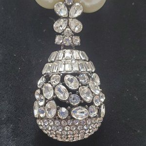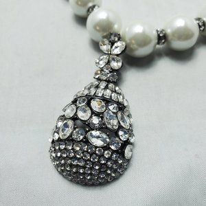 Pendant: The focal point is a substantial teardrop-shaped pendant, entirely encrusted with clear crystals or rhinestones. This pendant is suspended from a cluster of smaller, pearly, or crystal elements that connect it to the main pearl strand.