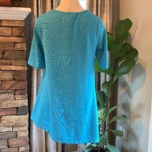 Ali Miles small robins egg blue tunic length top. Short sleeve. Top has a pattern. Spandex for stretch and comfort. Sleeve is a longer short sleeve. Fun pocket and button detail on front.