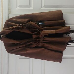 Features_ open-front, waist-tie, stylish fringe, and relaxed-fit collar, faux-suede finish