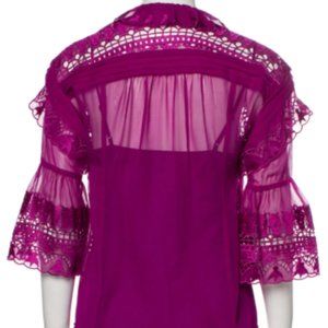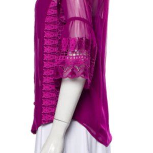 Silk V-Neck Button-Up Top. Lace, Ruffle & Embroidered Accents. Button Closure at Front. Size S / US 4, UK 8