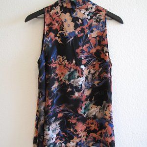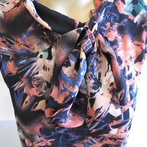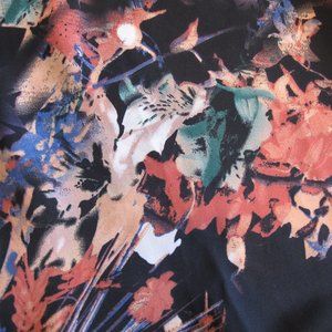 Abstract floral in black, rusty orange, coral, royal blue, peach and green