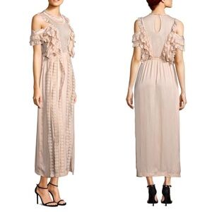 ALICE MCCALL 70s Satin Victorian Ruffle Pointelle Lace Cold Shoulder Maxi Gown 0