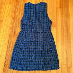 ALICE + OLIVIA Clyde Mini Sheath Dress Blue Plaid Metallic Tweed Frayed Hem (A) 1