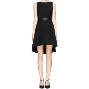 ALICE + OLIVIA "Colby" Leather Trim Cascade High Low Mini Sleeveless Black Dress
