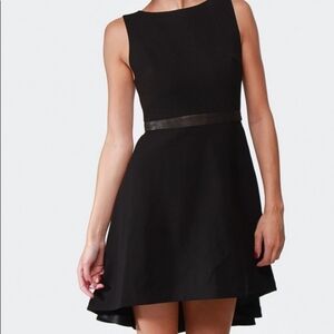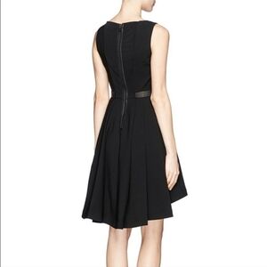 Alice + Olivia dress in size 6. High low cascade hem that will flow with every step. Lambskin leather waistband and interior of hem, which can be seen from the front (9th photo). The body of the dress has stretch. Front bust darts. Top has white satin lining. The skirt is pleated in back. Exposed black zip fastening with hook and eye closure. True to size. The perfect timeless black dress with luxury details. in excellent condition.