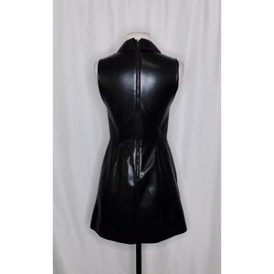 Point collar at neckline ~ Sleeveless ~ Fitted bodice with curved princess seams ~ Nipped in at the waist ~ Zipper closure on the front … ending at the waistline ~ Skirt has a slight A-line shape ~ Straight hemline ~ Mini length ~ Exposed zipper closure down the back ~ Fully lined ~ Exterior shell is a supple faux leather fabric ~ Solid black … so versatile!