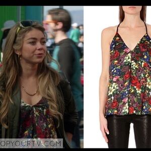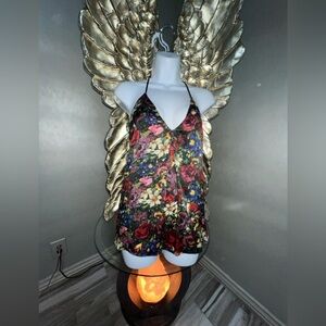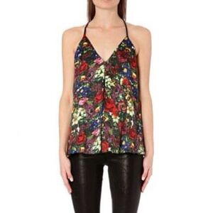 This ALICE & OLIVIA Guenda floral-print silk top. It is a halter style top with a deep V-neck and features a dark floral print on a silk material. Lamb Leather straps made in Italy, in good conditions.