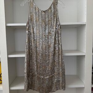 Self: 100% silk. Lining: 95% poly 5% spandex. Fully lined. Bead and sequin detail throughout. Exposed back zip closure. Size 8