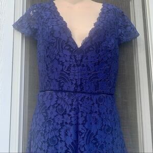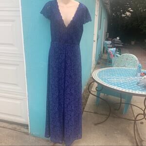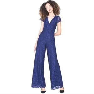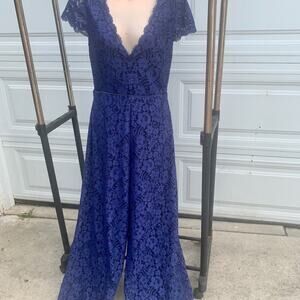 Excellent condition wide leg jumpsuit from Alice and Olivia in navy blue lace. Size marked is 8 but these run ver small - - more like a 2 so please go by measurements. Waist is 13 1/4” across, hip is 19” across. Underarm to underarm is 16”
