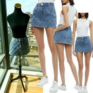 🆕 ALICE + OLIVIA 🧿 NWT Joss High-Rise Quilted Embellished Denim Mini Skirt, 26