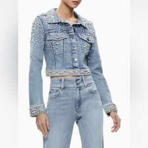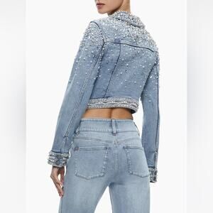 This stunning Alice + Olivia Nelson denim jacket is brand new in its original packaging, ensuring it arrives in perfect condition. All beads and embellishments are intact, adding a touch of sparkle and elegance to this cropped piece. You'll find the original tags and extra gems conveniently located in the front pocket for any future repairs.