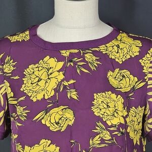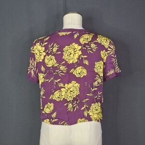 Vibrant women's top featuring a striking purple and yellow floral design. Perfect for adding a pop of color to your wardrobe.