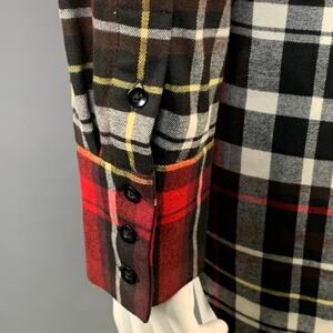 ALICE + OLIVIA shirt in a black, red, and white polyester blend twill featuring a plaid pattern with red plaid trim, two buttoned flap pockets, and button closure.