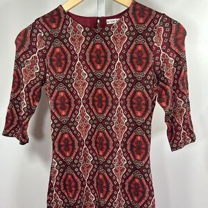 Pull-over style. Crew neckline. Elbow-length sleeves. Exposed back zipper closure. Burgundy red and white geometric print. Sheath silhouette. Light stretch. Midi.