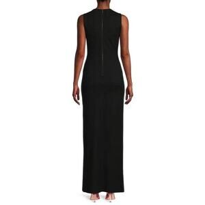 Jewelneck. Sleeveless. Back zip closure. Side slit. Sheath silhouette. Lined.