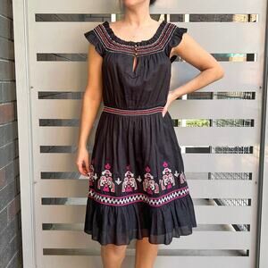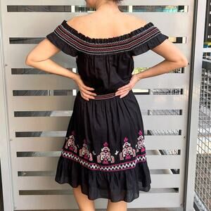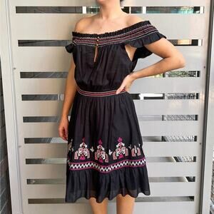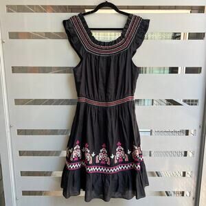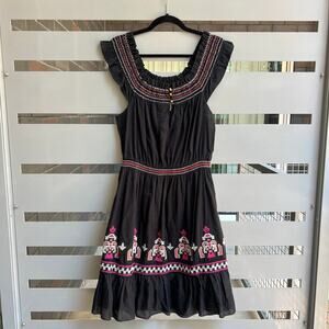 ALICE by Temperley black with pink and white embroidered prairie dress. Elastic off-the-shoulder collar, empire waist and fuller ruffled hem lined with geometric embroidery. Knee-length. Woven cotton fabrication. In excellent condition. Size US 6 - 17.5" pit to pit; 14" waist; 30" length from pit.
