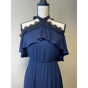 Fits true to size. Designed for a contemporary fit. Back-tie halter straps, lace-trimmed straight neck, off-the-shoulder silhouette. Elbow-length sleeves, tiered bust overlay, banded waist, lace-inset skirt. Maxi length, exposed back zip with hook-and-eye closure. Viscose; combination: cotton/nylon/viscose; lining: polyester/elastane.