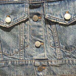 Alice+Olivia Jeff heart cut out Jean jacket. A slight cropped look. Rhinestone detail around every heart. Only one rhinestone is missing on the arm, pictured. No other callouts. Stock photo added for reference from the website.