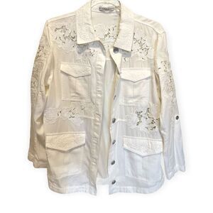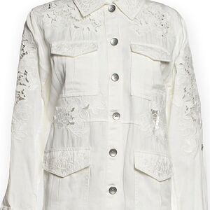 ALICE + OLIVIA Three-Quarter Sleeve Embroidered White Button-Up Top