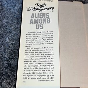 ALIENS AMONG US FIRST EDITION 1985 HARDCOVER VINTAGE BOOK RUTH MONTGOMERY w DUSTCOVER. Book is in very good to excellent condition with the only flaws being some discoloration of the color of the cover from light exposure where the dustcover ended and a dent on the bottom of the book cover. The dustcover has quite a bit of wear with discoloration and small tears on the edges. See photos for flaws and please ask any questions prior to purchase.
