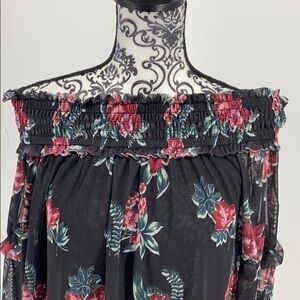 Feel effortlessly Romantic in this floral print off the shoulder Top by A + A collection. Made with 100% polyester. This peasant inspired top features a vibrant all over floral print and ruffled trimming. The smocked details and semi sheer flounce sleeves add femininity and grace to any outfit. Pullover style for easy wear and convenience.