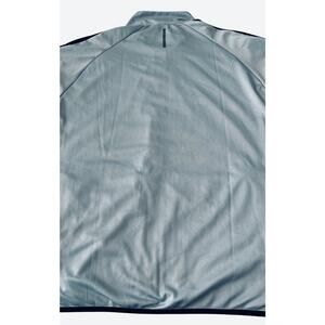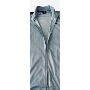 Gorgeous shade of Light Blue windbreaker - great for those breezy or rainy days! Quick-Dry material; 2 deep front side pockets; full 26" long front zipper; long Raglan sleeves (sleeves extend to the collar); upper sleeves have 1.5" wide Black mesh stripe; sleeve cuffs & bottom of jacket trimmed in Black; 2.5" wide stand-up collar; Alive logo on front upper left