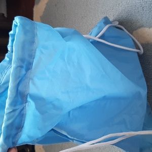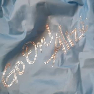 Ice blue limited edition water proof vinyl aprox 22×16 book bag with white chili strawberries things senching at the top to close. with Go On! Alize in silver RhineStone print