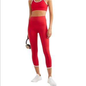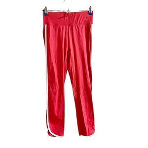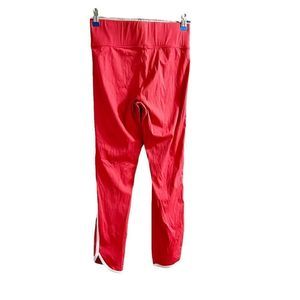 Vibrant red leggings with sleek white side stripes. High-waisted and stretchy for comfort.