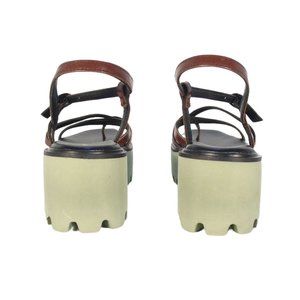 Cute platform sandals by All Black have a strappy brown leather upper and extra-light foam sole. Padded leather insoles. Adjustable buckle at the ankle. Traction pattern for a secure stride. Retail: $189.