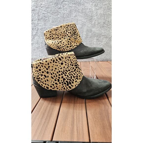 ALL BLACK Leather Ankle Booties Boots Leopard Calf Skin Fold Down EU 39 US 8.5