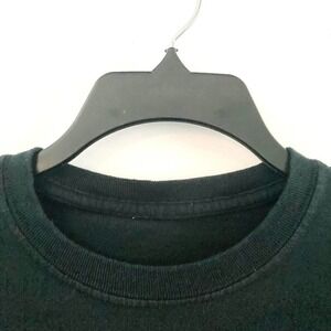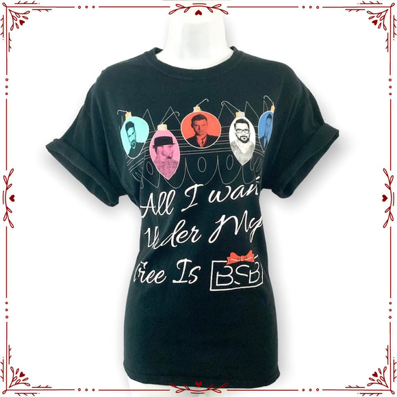 Short sleeve crew neck black Backstreet Boys t-shirt. Reads "All I Want Under My Tree is BSB" with BSB inside a present with a bow. All the members' faces are on ornaments. In preloved condition, normal wear (see photos for condition); as with any preowned clothes, you should wash before wearing the first time. Care and material content tag has been removed. Size tag has also been removed; please see measurements below. From a pet friendly home.