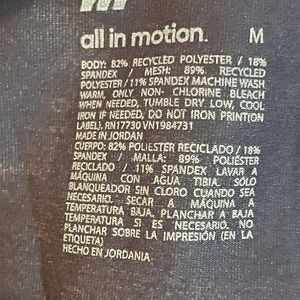 Step up your fitness game with these ALL IN MOTION athletic tights in a stunning blue color. Designed in a medium size, they offer a comfortable and supportive fit. The tights are made of a moisture-wicking fabric that keeps you dry and cool during intense workouts. With a stretchy composition of 82% recycled polyester and 18% spandex, along with mesh panels crafted from 89% recycled polyester and 11% spandex, these tights ensure optimal flexibility and breathability. The waist measures 13.5 inches (unstretched), and the rise is 10 inches. Embrace both style and performance with these new-with-tags ALL IN MOTION athletic tights.