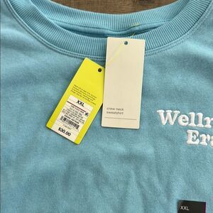 Cozy blue sweatshirt with 'Wellness Era' text. Perfect for casual wear.