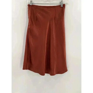 Elevate your wardrobe with this stunning rust red satin skirt from ALL ROW. This versatile piece is perfect for any occasion, whether it be for travel, workwear, or a casual day out. The flare style and mid-rise fit make it a classic and timeless addition to your closet. Crafted from high-quality polyester, this lightweight skirt features a zip closure and is easy to care for with hand wash only. The solid pattern and classic American theme add a touch of sophistication to your outfit. This skirt is a must-have for any fashion-forward woman and is available in size small (26W x 22L).