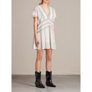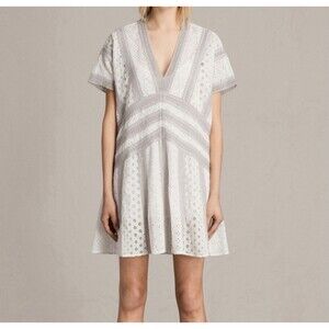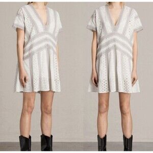 The ALL SAINTS Cyndi Tee Eyelet Lace Mini Dress in women's size M is a stylish and versatile piece perfect for casual occasions. Made from cotton fabric and featuring a flattering V-neck and short sleeves, this ivory dress with a slightly flared hem accent exudes a trendy and feminine vibe. The eyelet lace detail adds a touch of romance to the short dress length, making it a standout choice for summer, fall, and spring seasons. To care for this dress, it is recommended to hand wash only, ensuring its longevity and maintaining its chic appearance.